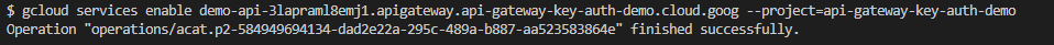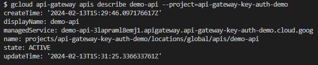 API Key Authentication with Google Cloud API Gateway and Cloud Run Posted on February 10, 2024February 15, 2024 By Justin Enable API Gateway API Earlier, when you ran the gcloud command to create the API Gateway API, I mentioned that you should note the managedService value because you were gonna need it later. Well, now’s the time. Don’t worry, though. If you forgot it or lost it, gcloud is here to help. Just run: gcloud api-gateway apis describe {{API_ID}} --project={{PROJECT_ID}} Where: {{API_ID}}: The ID of the API Gateway API created in the previous section. (e.g. demo-api). {{PROJECT_ID}}: Name of the Google Cloud project you’re using for the tutorial (e.g. api-gateway-key-auth-demo) And you should see something like this: Now we just need to run another quick gcloud command to enable that API so we can actually grant the key we’ll create in the next section access to call it. gcloud services enable {{MANAGED_SERVICE}} --project={{PROJECT_ID}} Where: {{MANAGED_SERVICE}}: The managedService value for our API (e.g. demo-api-3lapraml8emj1.apigateway.api-gateway-key-auth-demo.cloud.goog). {{PROJECT_ID}}: Name of the Google Cloud project you’re using for the tutorial (e.g. api-gateway-key-auth-demo) Pages: 1 2 3 4 5 6 7 8 9 10 11 12 Backend Stuff APICloud RunGCPPythonTutorial
